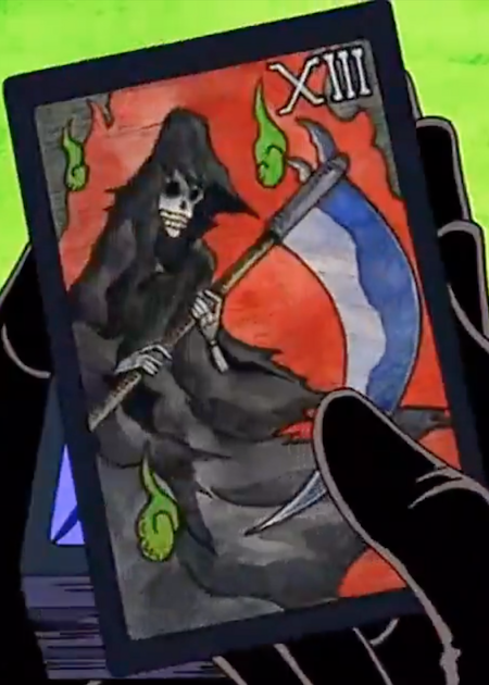 La carta de La Mort es va veure canònicament per primera vegada quan en Hawkins la va treure al Capítol 1029. Es va demostrar que tenia un disseny diferent de la seva representació a l'anime.[17] La carta de La Mort de l'anime tenia a la Parca a l'esquerra de la carta mirant lleugerament cap a la dreta, duia una dalla gruixuda i tenia tres focs follets verds al voltant. La carta canònica de la Mort tenia a la Parca al centre de la carta mirant cap endavant, portant una dalla prima, i tenia el que sembla que són dues serps darrere, cada una a banda i banda mirant cap enfora.