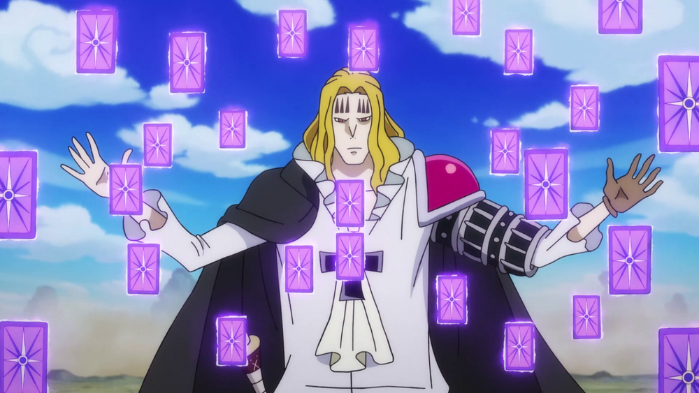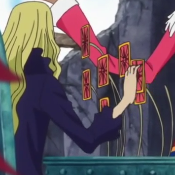 Quan en Hawkins estava sent interrogat per en Trafalgar Law, les seves cartes estaven escampades al terra. L'aspecte de la carta de La Mort es va simplificar perquè coincidís amb la resta de cartes. La carta del Hierofant es va tallar per la meitat.[16]