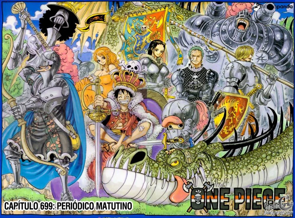 Portada a color: Els Pirates del Barret de Palla amb armadures medievals, juntament amb un drac verd. En Ruffy és el rei, mentre que la Nami és la reina o la princesa i tots els altres membres són cavallers.