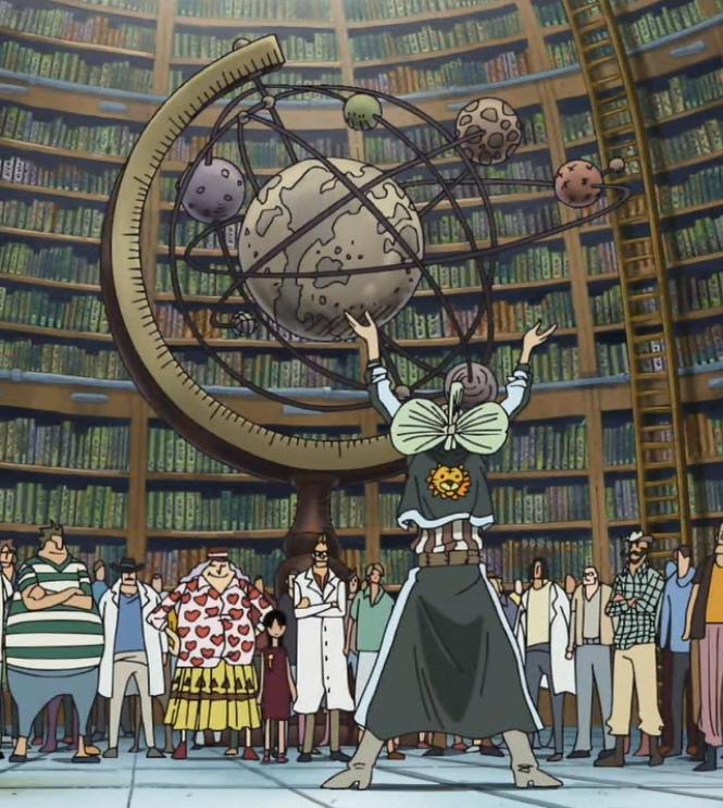 - ↑ One Piece Manga i Anime - Vol. 41 Capítol 392 i Episodi 275, es mostra el model geocèntric del món a l'Arbre del Coneixement d'Ohara.