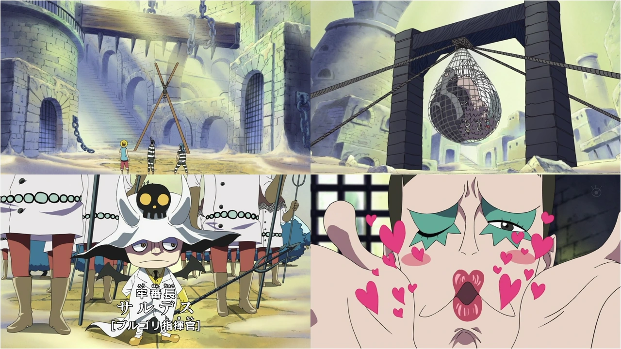 En Ruffy, en Buggy i en Galdino es troben al Nivell 3, un nivell de calor extrema. Es veuen atrapats en una xarxa d'en Saldeath, el comandant del Nivell. No obstant això, gràcies a la intervenció de la bèstia, se les arreglen per escapar. En Buggy i en Galdino se les arreglen per treure a en Ruffy. Després, es troben un Agent de la Banda Baroque, en Mr. 2 Bon Kure, que l'estada a la presó no li ha canviat el seu esperit.