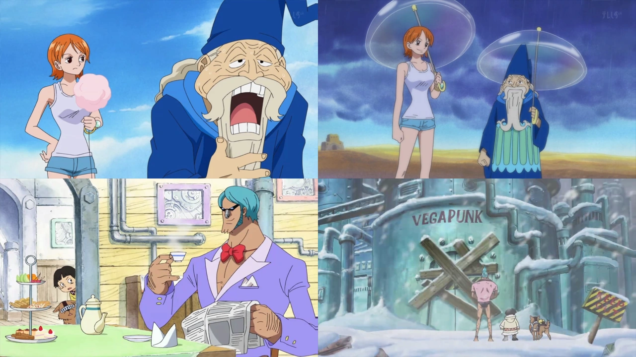 Mentrestant, en Franky no deixa d'actuar com un cavaller sota els efectes del te. En Kitton comenta que potser al laboratori d'en Vegapunk i trobarien cola pels seus motors però que és un camí perillós. Tot i així en Franky decideixi anar-hi i pel camí és atacat pels animals ciborg del bosc cosa que fa bullir el te i reactivar la seva personalitat permetent-li derrotar els animals. Un cop arriben a la casa en Kitton li diu que és en Vegapunk i entren tot i el cartell de prohibició activant una alarma de la casa.