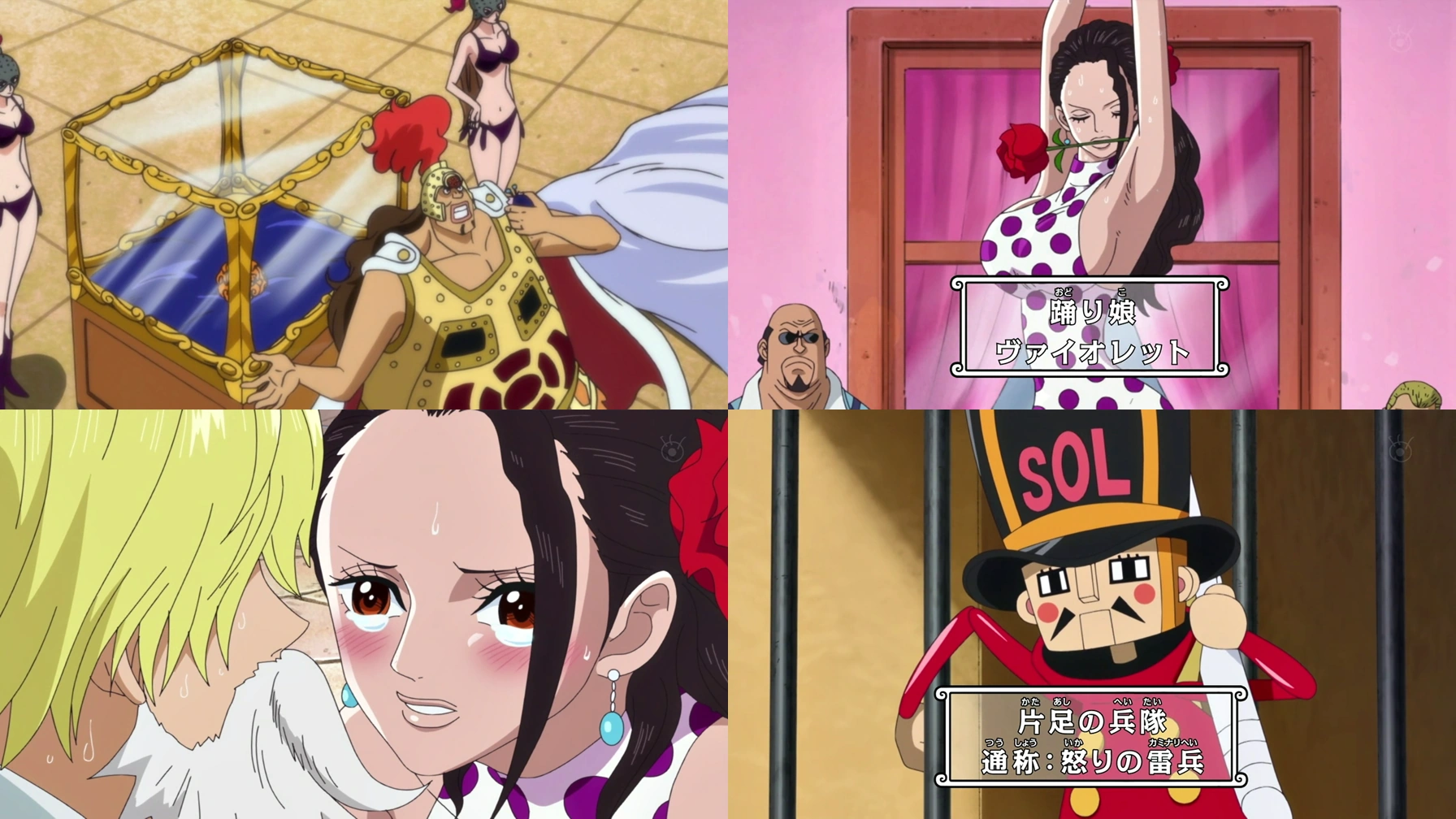 En Kin'emon busca en Kanjuro. En Ruffy i en Franky arriben al coliseu i veuen com uns policies persegueixen un soldat que puja als murs i diu que en el Coliseu Corrida l'única llei que importa és la de la Família Donquixot, i que la policia i la Marina no poden arrestar-hi ningú. Finalment en Ruffy va a inscriure al torneig.