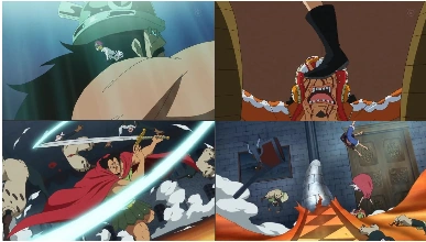 La Koala, en Sabo, la Rebecca i en Bartolomeo baixen al port subterrani, on finalment en Sabo es revela. Expliquen que l'Exèrcit Revolucionari és allà per aturar la distribució d'armes als països en guerra, però els molts revolucionaris que havien estat enviats a Dressrosa havien sigut convertits en joguines. En el palau reial, en Kyros derrota en Buffalo i la Baby 5, i quan en Ruffy és a punt d'obrir les manilles de Kairoseki d'en Law, en Doflamingo revela que està viu. Sense cap altra opció, utilitzarà la Gàbia d'ocells, tot i l'horror d'en Law.