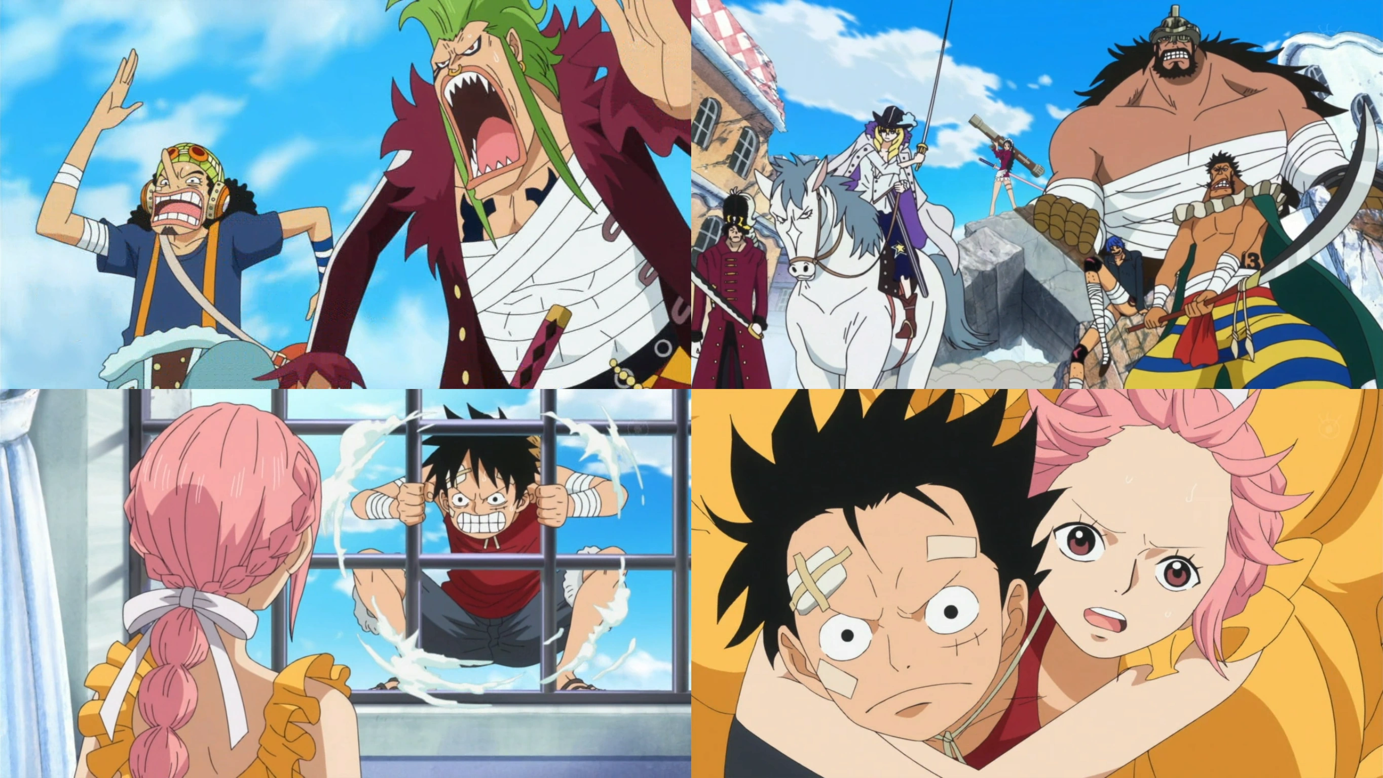 La Marina encercla la casa d'en Kyros i els Barret de Palla, en Law, en Bartolomeo i en Bellamy fugen. Tot i això, en Ruffy se separa del grup dient que ha de fer una cosa. Els marines ocupen tot el territori de Dressrosa, però els gladiadors del Coliseu Corrida obren camí als Barret de Palla.