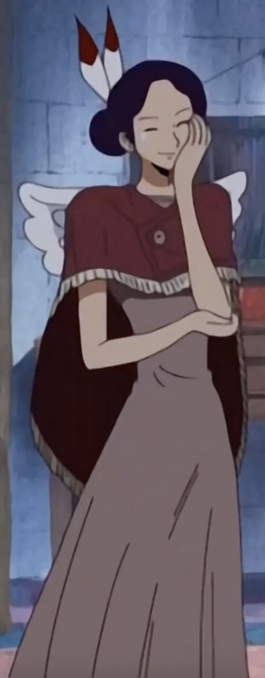Era una dona de mida mitjana, amb els cabells negres lligats a un monyo a l'esquena, amb plomes decoratives i dos fils penjats. Portava una camisa grisa, amb volants blancs a la part inferior i una llarga faldilla marró vermellós que li anava fins als turmells. A la camisa duia un petit abric vermell fosc, sense mànigues cobertes per sobre de les espatlles i abotonat amb un botó i una franja blanca al botó.