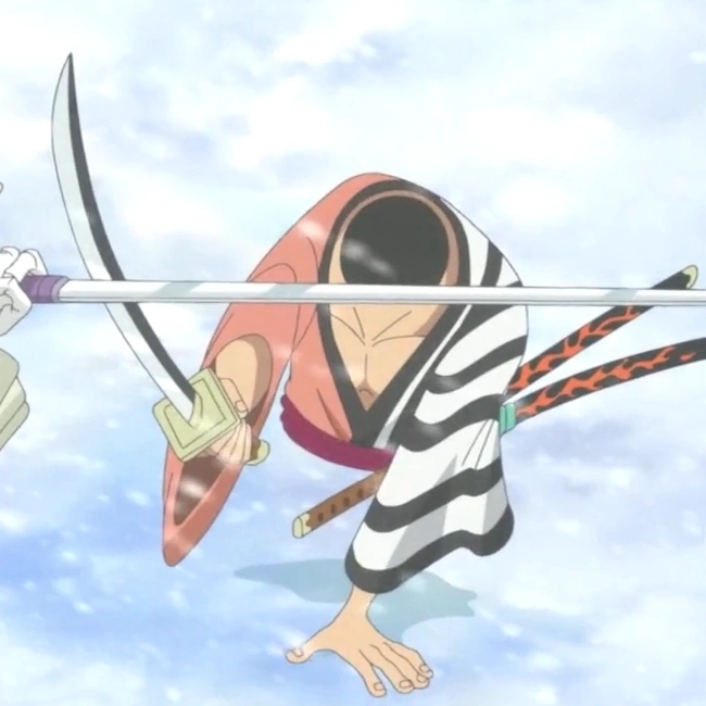 Després d'assabentar-se que en Zoro és l'actual portador de la Shūsui, l'espasa de l'heroi del País de Wano, en Kin'emon canvia la seva actitut cap a ell, dient que vol una lluita per derrotar a en Zoro i portar al País de Wano el tresor nacional.