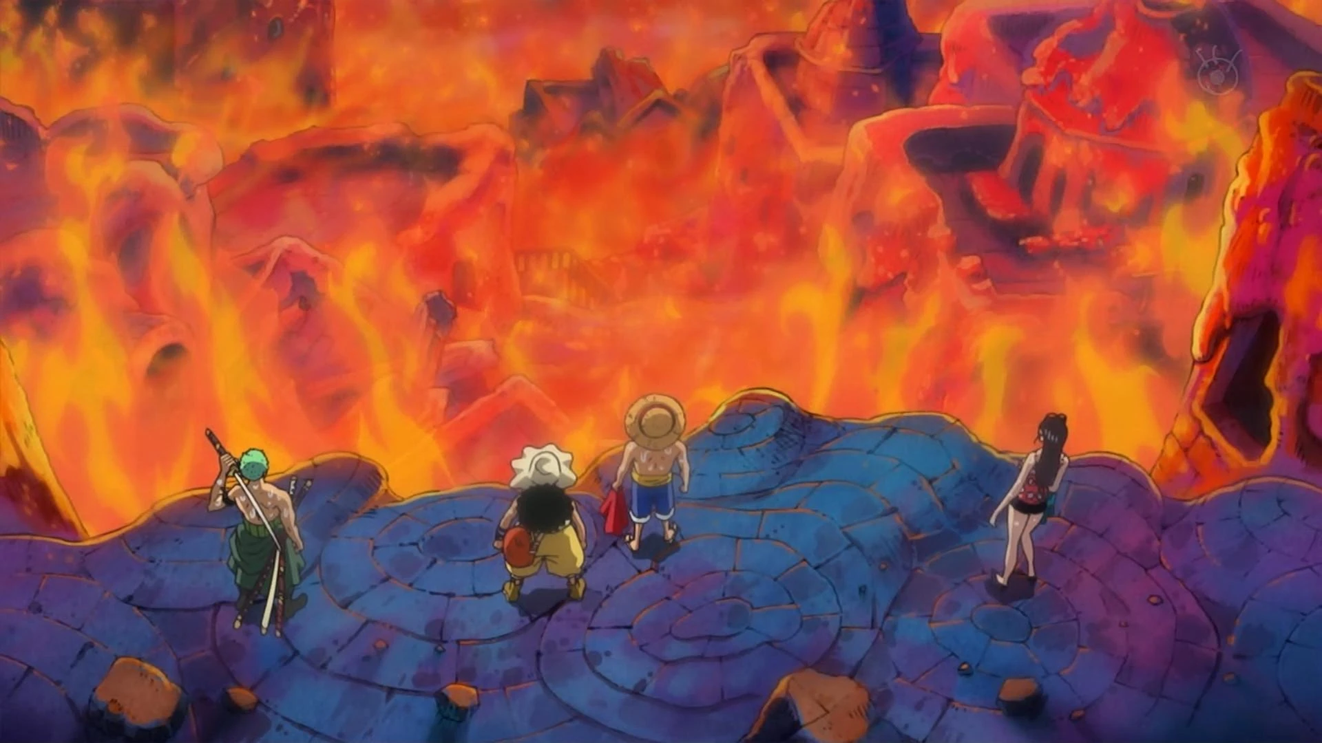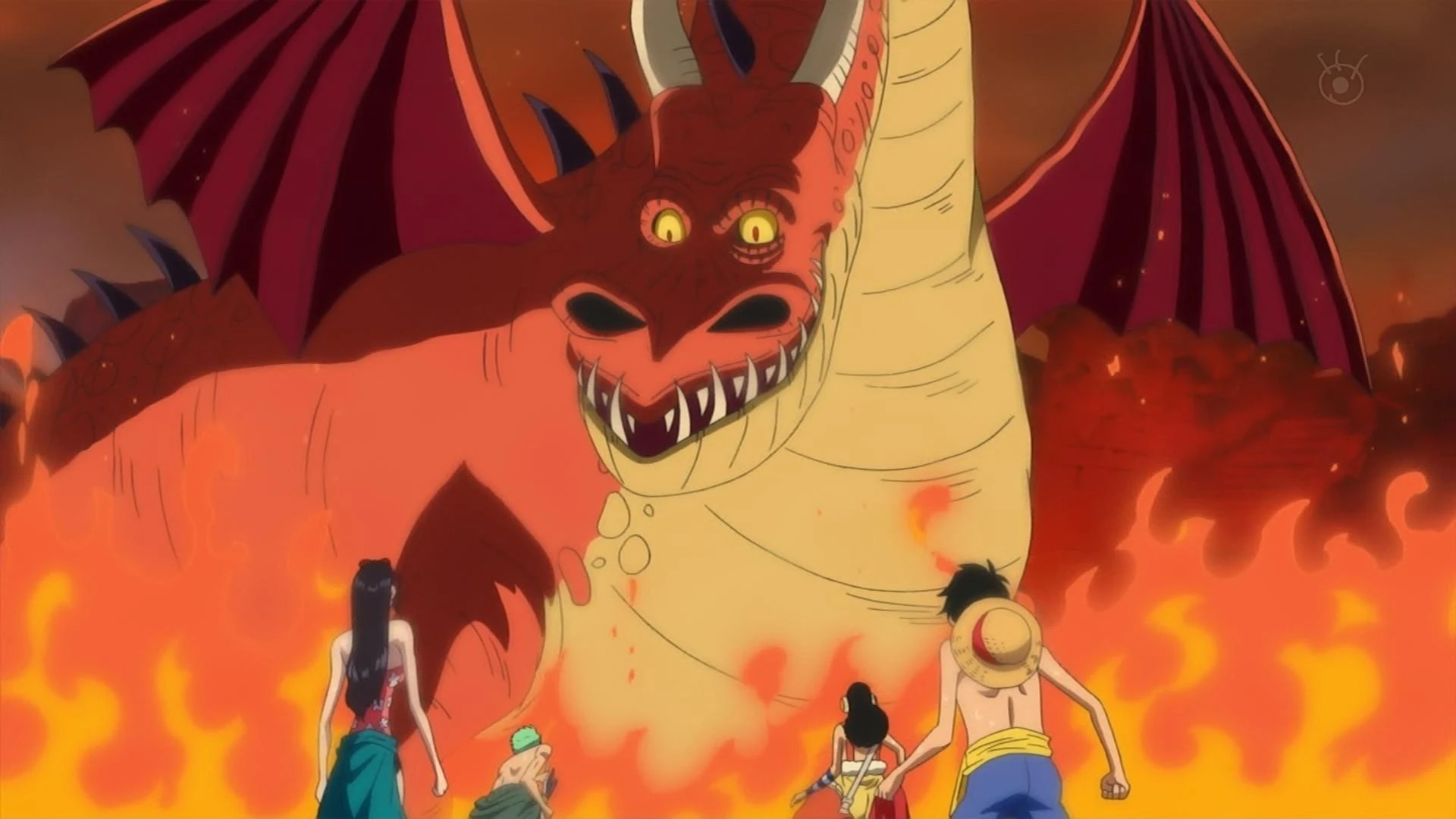 Quan la tripulació del Barret de Palla rep una trucada de socors en Ruffy decideix anar a l'illa a rescatar la persona i a explorar-la. Per un sorteig la Robin, en Zoro i l'Usopp l'acompanyen. Quan arriben allà esbotzen la porta i entren a l'illa. L'Usopp comenta que és estrany que la persona de la trucada esmentés que allà feia fred si està tot en flames. L'equip es posa a buscar la persona quan un drac s'apareix darrere seu i els demana qui són.