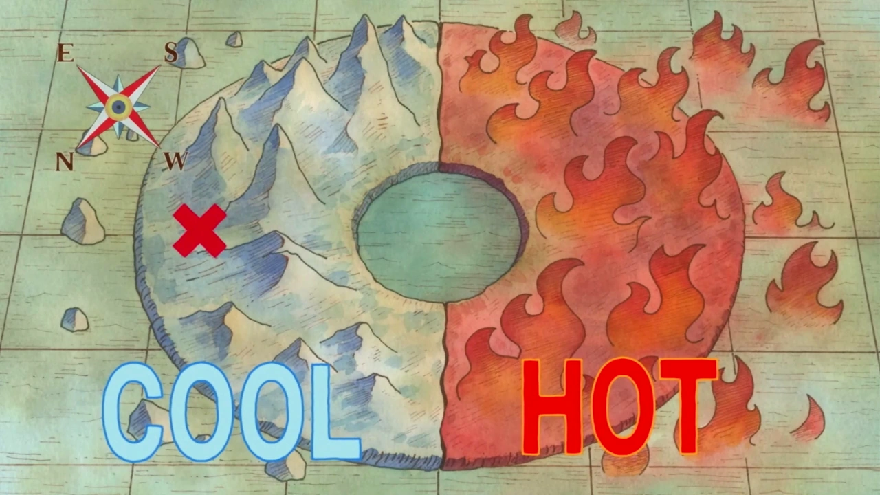 La Nami comenta que el cel de l'illa és molt estrany i que sembla com si a la part que hi ha darrere de les flames hi hagi un cel típic d'una illa d'hivern. Aquest fet tan insòlit és possible a causa de que es tracta d'una illa dividida, una part és plena de volcans i envoltada de flames i l'altre és una illa d'hivern amb muntanyes gelades i el mar congelat. Les dues part estan separades per un enorme llac que hi ha al mig de l'illa, resultat del punt on van xocar els poders dels dos almiralls.