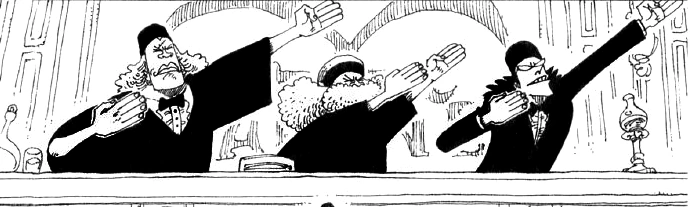 - ↑ 1,0 1,1 1,2 1,3 1,4 One Piece Manga — Vol. 18 Capítol 164, mini-història de portada: El paradís de ball d'en Jango Vol. 30, apareixen els tres jutges.