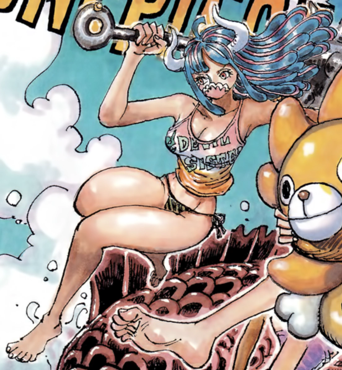 Mentre lluitava contra la Nami i l'Usopp en la seva forma híbrida, la Ulti els va ferir greument mitjançant cops de cap, i ella i el Page One van fer front fàcilment els atacs de l'Usopp. Després de derrotar i deixar a l'Usopp malferit, la Ulti va agafar a la Nami i es va preparar per acabar amb ella. La Nami va prometre deixar Onigashima si la Ulti la perdonava, i aquesta li va ordenar que digués en veu alta que en Ruffy mai no es convertiria en el rei dels priates. No obstant això, la Nami va respondre que en Ruffy ho faria i, quan la Ulti es preparava per matar-la per això, de sobte va ser mossegada per un komainu muntat per la Tama. Mentre la Nami, l'Usopp i la Tama fugien, la Ulti es va queixar de l'arribada d'aquesta.[16] Poc després, els germans havien derrotat el babuí i els dos van trencar una paret de la cúpula del crani cap a l'exterior, tots dos com a dinosaures totalment transformats, buscant trobar els barrets de palla escapats.
