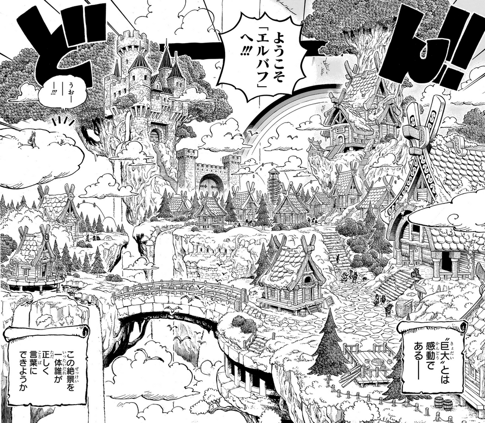 De regreso con el grupo de Luffy, estos se encuentran escapando de Road en la cima de una montaña, con la única ruta allí siendo un puente gigante colgante. Justo cuando los Sombrero de Paja deciden atravesarlo, tuvieron que esconderse rápidamente, ya que vieron a otros dos gigantes cruzando el puente. Estos gigantes resultaron ser Gerd y Goldberg de los Nuevos Piratas Gigantes Guerreros, los sombrero de paja permanecieron ocultos porque no los conocían, mientras los dos gigantes discutían el vergonzoso comportamiento de Road. Resulta que la lechuza mascota de Gerd, Piper, había visto a Muginn trasportar un pequeño barco para Road, y decidieron confrontarlo por traer activamente intrusos sin permiso a Elbaph. Después de escuchar la conversación a escondidas, los sombrero de paja siguieron atravesando el puente, y a mitad de camino, Luffy decidió ingresar al bosque de abajo, para investigar una voz que había estado sintiendo desde que despertó en el Castillo de Bigstein. Pronto encontró a un gigante con los ojos vendados y encadenado que sintió a Luffy y exigió saber quién era. Luffy se presentó como el futuro Rey de los Piratas, y cuando le preguntó al gigante quién era y dónde estaban, declaró que era Loki, el Dios del Sol, y que estaban en Elbaph. [9]