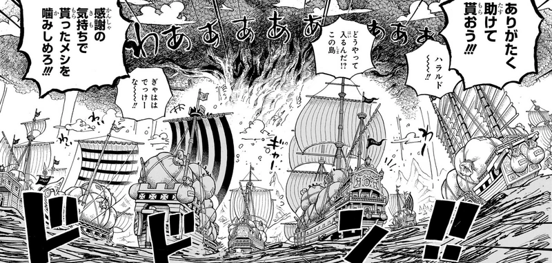 Siguiendo su camino a Elbaph, en el barco de los Piratas Gigantes Guerreros, los Gigantes, Nico Robin, Franky, Brook, Jinbe, Jewelry Bonney y Lilith se dan cuenta de que no pueden encontrar el Thousand Sunny donde estaban a bordo los Piratas de Sombrero de Paja restantes.