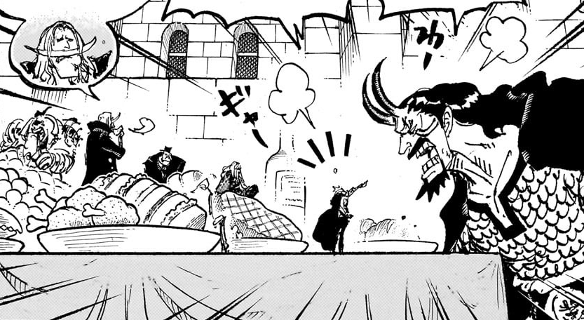 En el Inframundo, Loki, les cuenta a los Nuevos Piratas Gigantes Guerreros y a Luffy que fue atacado por los Caballeros de Dios, lo que los sorprende. Hajrudin se pregunta si esto fue una retribución por sus pasadas matanzas en el mar, pero Loki lo refuta, afirmando que si hubiera llegado lo suficientemente lejos como para encontrarse con ellos, ya sería rey del mundo. Goldberg, Zoro y Sanji regresan de su expedición de caza mientras los otros Gigantes preparan una fogata. Una vez cocinada la carne de Groggysaurus cazada, Luffy intenta metérsela en la boca a Loki sin dejar que se enfríe, lo que quema a Loki y le hace preguntarse si Luffy intenta matarlo reabriéndole las heridas. Aunque Loki come la carne, le cuesta hacerlo tumbado de espaldas y empieza a ahogarse. Luffy agarra rápidamente una taza de sopa que aún estaba hirviendo y, sin querer, la derrama sobre Loki, quemándolo aún más. Loki exige que lo mantengan lo más lejos posible, pero Gerd con una sonrisa le da un visto bueno al emperador por lo que hizo.