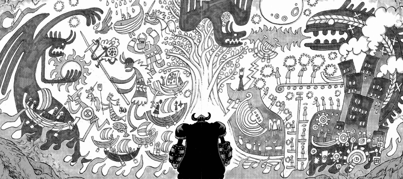 Tal como se muestran en estos capítulos, así es el mural que ve Franky, representando increíbles dibujos y conflictos que simbolizan los tres "mundos". [17]
