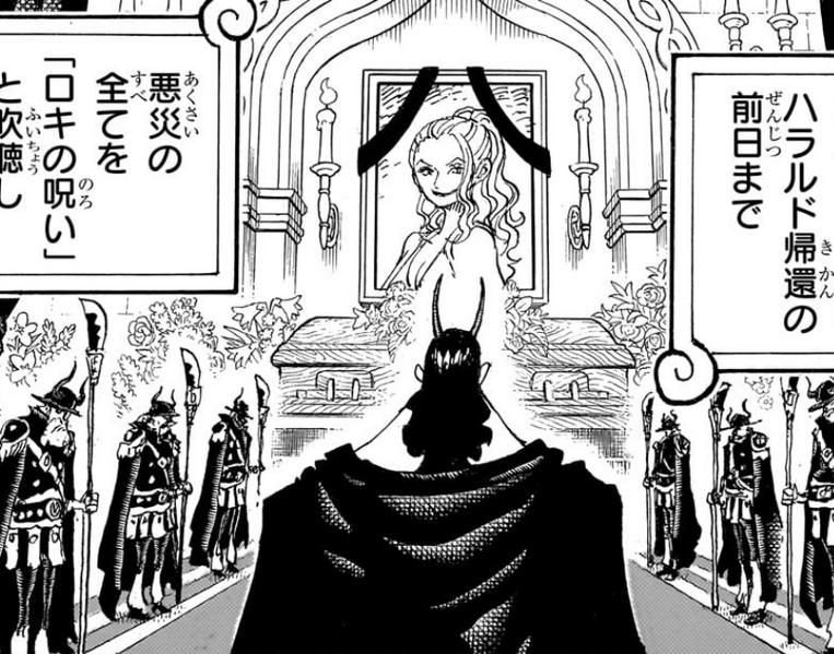En el inframundo, Loki tuvo una conversación con una persona misteriosa llamada Mosa a travez de un Den Den Mushi. Loki discutió un trágico incidente que involucró a Mosa y afirmó que habría matado a todos los presentes si estuviera en su lugar. Luego, los dos discutieron y Mosa pensó que Loki expresó algo de amabilidad, pero le gritó enojado y afirmo que esperara hasta que escapara del encarcelamiento. Mientras los gigantes estaban de fiesta en la Villa Occidental en el Mundo del Sol, dos figuras encapuchadas, una de las cuales parecía ser Shanks, llegaron al interior del gran castillo a través de círculos mágicos. [13]