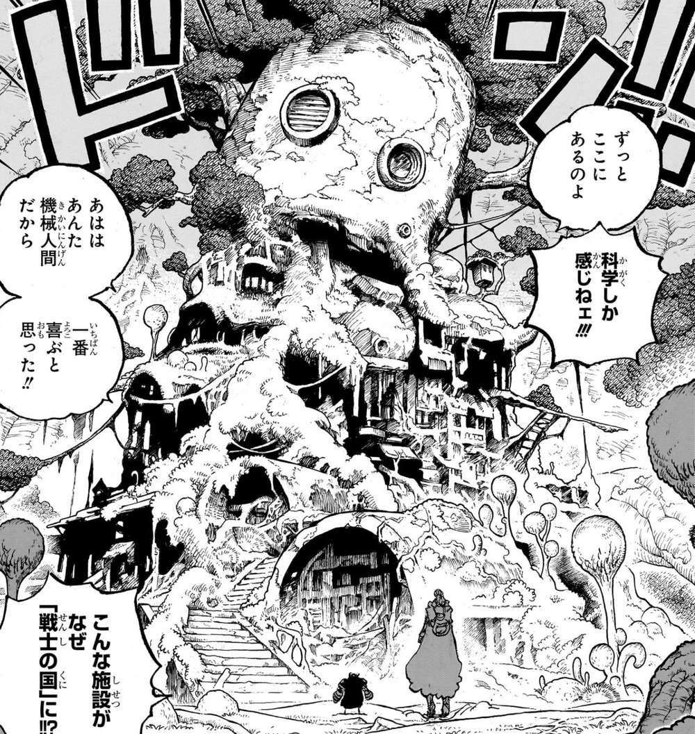 Mientras el grupo de Luffy abandona el castillo, Nami se queja de que no pudo encontrar ningún tesoro, que fue la razón principal por la que se unió a ellos en primer lugar, pero Road intenta que no diga esas declaraciones frente a los guardias heridos mientras intenta convencerlos de que no ha ocurrido nada. En otra parte, Franky continúa su recorrido por el Árbol del Tesoro Adam junto a Ripley, mientras ella le explica que viven en las enormes ramas del árbol, se encuentran con una rama cortada y menciona que ahí una vez hubo un pueblo llamado Haugen, y que esté destruido cuando un rayo golpeó la rama y se incendió. Como era tan viejo, el fuego no se detenía, lo que provocó que el resto de los Gigantes lo cortaran para evitar que se extendiera. Franky se sorprende al saber que un árbol tan fuerte puede envejecer y debilitarse, y Ripley finaliza su historia alegando que los principales puntos débiles de Elbaph son el fuego y los rayos.