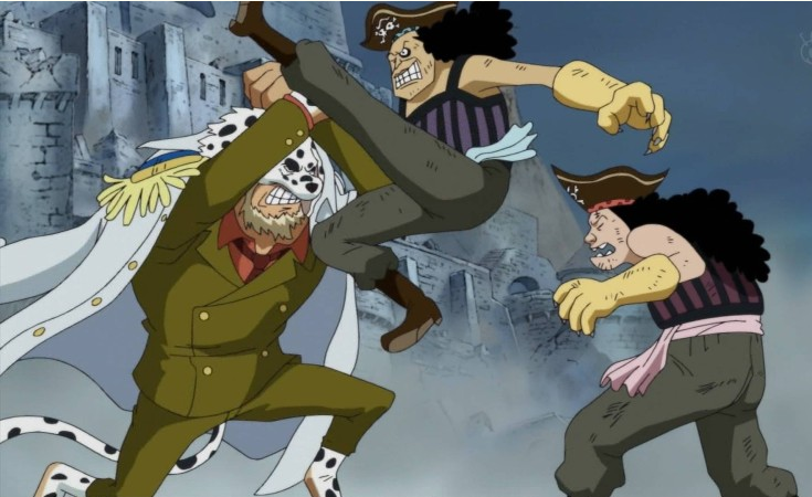 Oars Jr. vs. Bartholomew Kuma, Donquixote Doflamingo y Gecko Moria[]