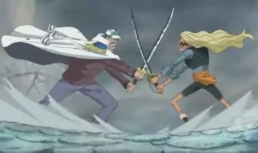 Kuzan salta para congelar con su ice age el tsunami creado por Edward Newgate, después de hacer esto, Kuzan utiliza su ataque ice block partisan para lanzarle varias lanzas de hielo a Edward, pero este rompe sus lanzas y su cuerpo usando el poder de su fruta, sin embargo, Kuzan se vuelve a armar en el agua, congelando esta.
