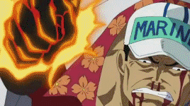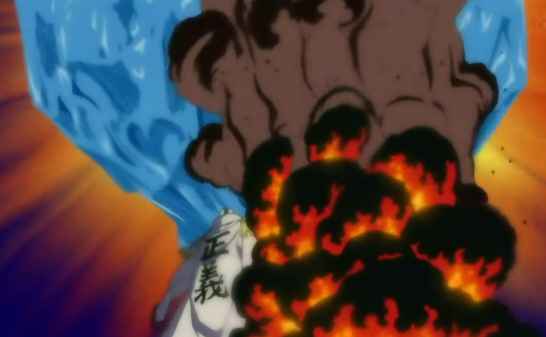 Jozu quiere lanzar un iceberg contra Marineford y los marines gigantes y Sakazuki lo detiene con un puño de magma. Así dando un golpe muy eficaz ya que los iceberg son de hielo.