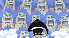 El comandante de la decimotercera división de la Banda pirata de Barbablanca, Atmos, se encuentra en plena batalla derrotando a gran cantidad de marines, encontrándose en un momento dado a Doflamingo riéndose en medio de la batalla.