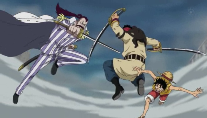Luffy corre hacia la plataforma de ejecución para salvar a Ace y el Dracule Mihawk decide que será él quien le impida avanzar con el fin de cumplir con su función de Señor de la Guerra del Mar.