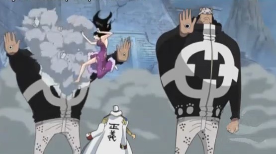 Borsalino intenta acabar con Oars Jr, pero Luffy aparece frente al trío de almirantes gracias al kairyu ipponzeoi de Jinbe, posteriormente, le lanza a los almirantes el trozo de madera que llevaba consigo, el cual es congelado por Kuzan y, tras congelarlo, se lo devuelve. Luffy lo destruye usando su stamp gatling, luego, logra pasar de los almirantes gracias a su gear second, pero Borsalino, gracias a su elevada velocidad, lo patea y lo estrella contra un muro.