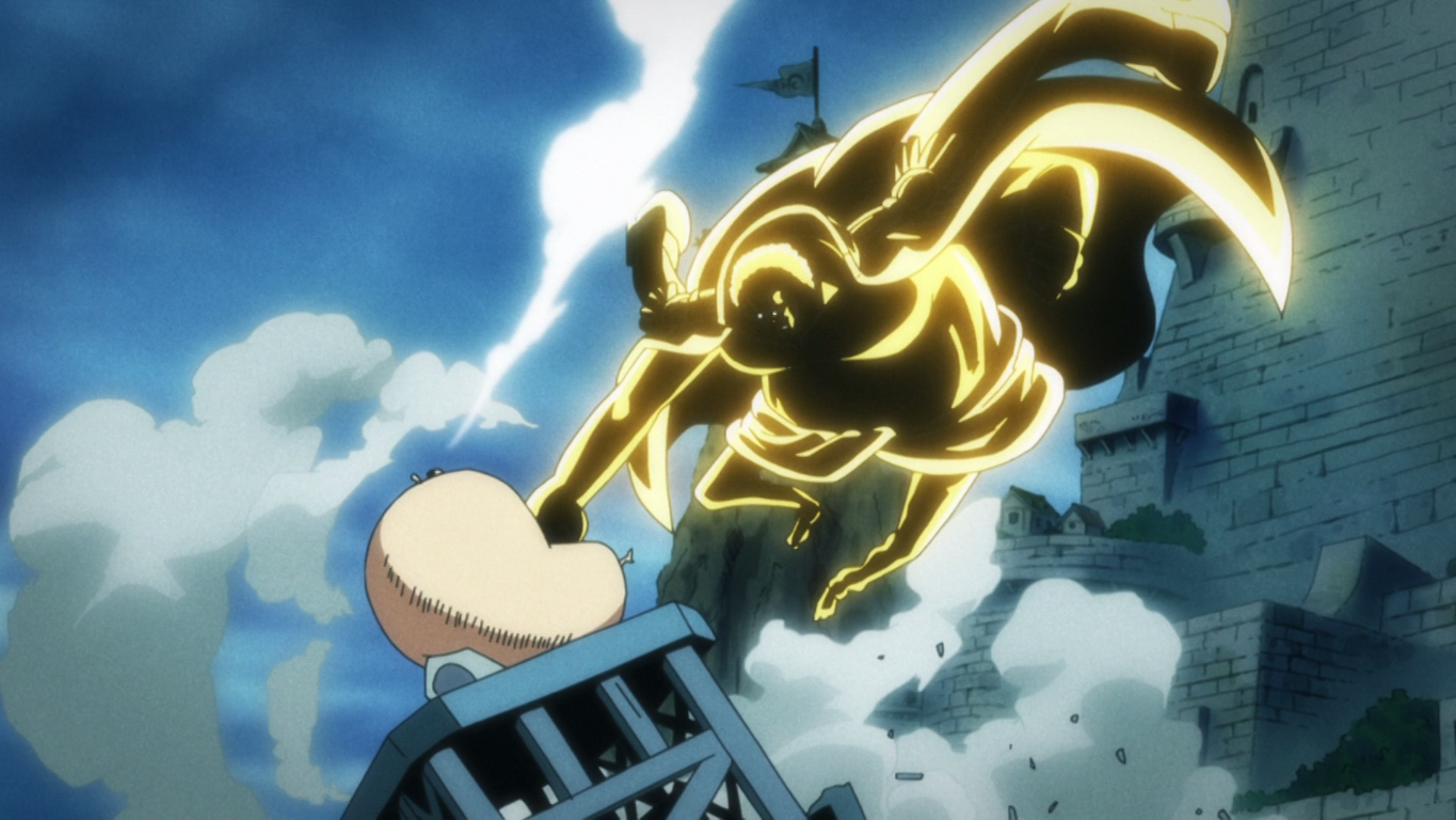 Luffy intenta continuar su carrera contrareloj y conseguir rescatar a su hermano Ace, pero muchos marines se interponen en su camino, como el escuadron de gigantes. Varios de ellos fueros derrotados por Barbablanca o por sus aliados, aunque uno intenta detener a Luffy utilizando su maza, a lo que Luffy responde utilizando su técnica Gear Third, hinchando su brazo izquierdo y convirtiendolo en un brazo gigante para golpear al gigante, derrotarlo y poder continuar su camino.