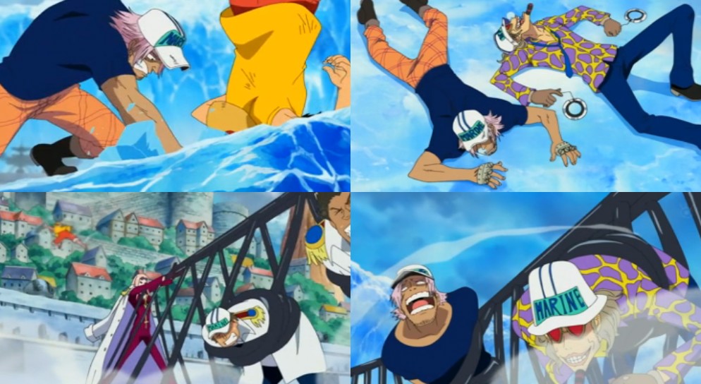 Jango y Fullbody atacan a Luffy en un combo en el que Jango obliga a detenerse a Luffy lanzando sus chakrams y luego Fullbody le ataca cuando este acaba de aterrizar pero Luffy esquiva ambos ataques. Más tarde la pareja de Marines le recuerda a Luffy quienes eran y Jango trata de hipnotizarle pero en el momento clave Luffy se distrae con una explosión y quedan Jango y Fullbody dormidos en su lugar. Hina patea a sus incompetentes subordinados e intenta atrapar al hombre de goma con su poder de jaulas pero Luffy usa el Gear Second y gracias a su velocidad adicional escapa, quedando los otros marines presos de ataque de Hina.