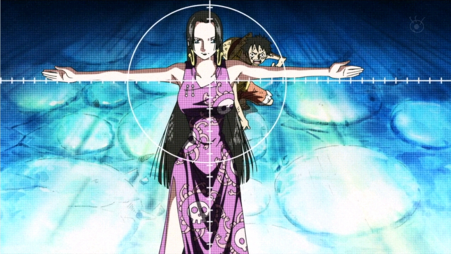 Boa Hancock protege a Luffy de algunos Pacifistas que se preparaban para atacarle. Ella se interpone entre el pirata y los Pacifistas, quienes detectan que ella es una Shichibukai y detienen el ataque. Luffy le agradece el haberle protegido y sale corriendo, a lo que por haberla llamado por su nombre, Hancock empieza a soñar con él. En ese momento, los Pacifistas exigen que se aparte para poder seguir a Luffy, ella se enfada y comienza a atacarlos por haberla llamando usando su nombre (Boa), y ataca al Pacifista que la había llamado dándole una patada para callarlo posteriormente, convirtiéndolo en piedra.