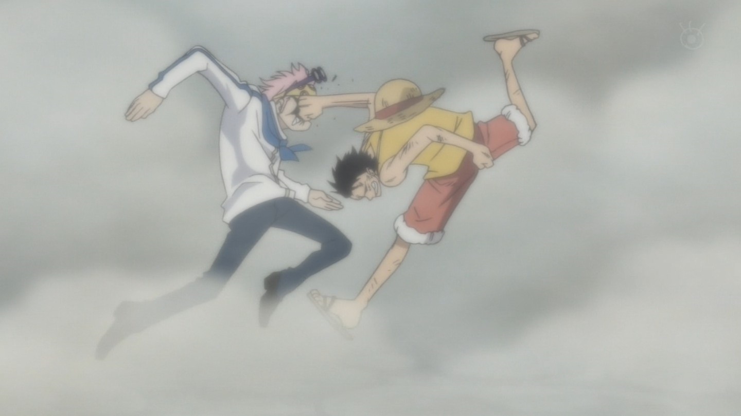 Smoker utiliza el poder de la fruta Moku Moku para volar hacia Luffy y golpearlo en la cara con su jutte de Piedra Marina, Luffy activa el gear second e intenta golpear a Smoker con el gomu gomu no jet gatling, sin embargo, los puños no tienen efecto en el al ser un Logia, luego, Smoker utiliza su poder para convertirse en humo y volar lejos, luego aparece Tashigi e intenta cortar a Luffy con su espada, pero el pirata esquiva el ataque, luego, Luffy intenta golpear a Smoker, fallando y siendo atrapado por el jutte de Smoker. Después Hancock salva a Luffy pateando a Smoker.