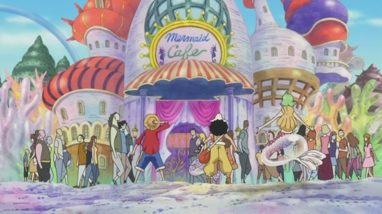 Camie los lleva con un grupo de amigas, haciendo que Sanji se vuelva loco. Mientras Luffy le dice a Camie que está interesado en ir a ver a alguien, quien resulta ser Jinbe con quien había prometido verse en la isla Gyojin cuando Luffy terminara su entrenamiento y se reuniera con su tripulación; Camie le dice que debido a que Jinbe ya no es un Guerrero del Mar, él y sus seguidores debieron abandonar la isla. Justo después unos miembros de la familia real llegan buscando a Luffy y su tripulación, pero ellos son escondidos por las sirenas para protegerlos ya que pensaban que serían arrestados por haber entrado de forma ilegal.
