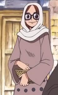Lleva un pañuelo blanco alrededor de la cabeza y tiene una túnica marrón claro con manchas moradas, en la parte inferior. Tiene el cabello castaño y usa gafas gruesas, cuadrados y con esquinas redondeadas.[1]