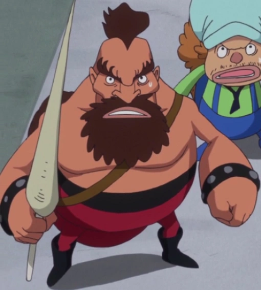 Apareció, por primera vez, cuando Zoro y Franky estaban en la guarida del Ejército Real Riku, junto con Cotton e Inhel.[3]