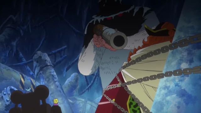 Pese ello, se acobardó, al ver a Hawkins transformándose y al reconocer a Luffy.