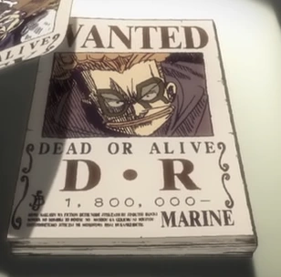 - El cartel de recompensa de D.R puede ser visto, en el episodio 45, en el barco de Fullbody. Otro puede ser visto en el Bar Gold Roger, en el episodio 48. Los carteles están tachados, por lo que fue capturado o se confirmó su muerte.