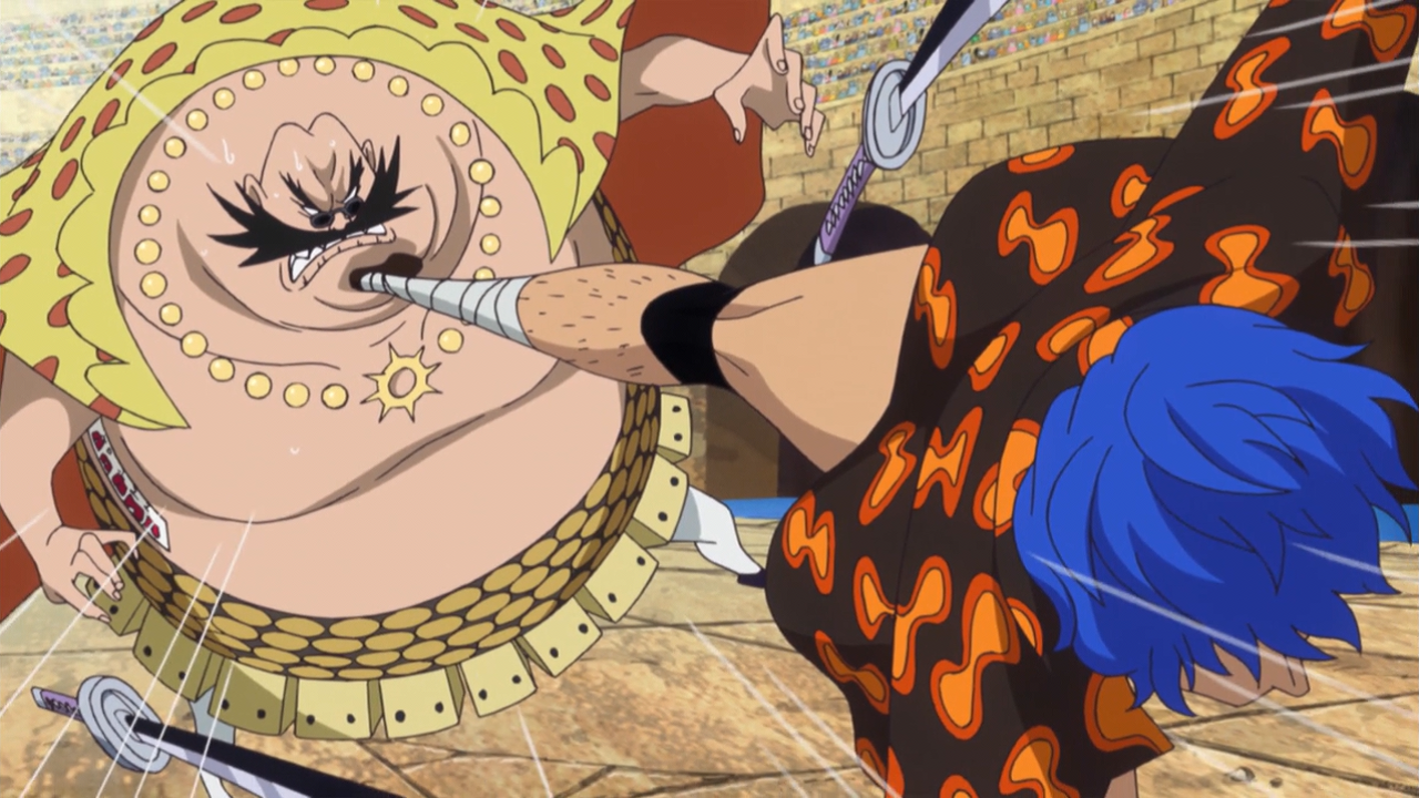 Se le ve después, junto a su rey Elizabello II y los demás gladiadores del coliseo, dispuesto a ayudar a Luffy a derrotar a Doflamingo. Luego se le ve siendo testigo de cómo su rey Elizabello II y Don Chinjao destruyen el brazo del golem de roca gigante de Pica.
