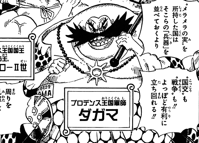 Dagama (ダガマ Dagama?) es un estratega, al servicio del Reino de Prodence. Él participó, junto a su rey Elizabello II, en el Bloque 'B' del Coliseo Corrida para ganar la fruta Mera Mera, para fortalecer el poder de su reino.[1]