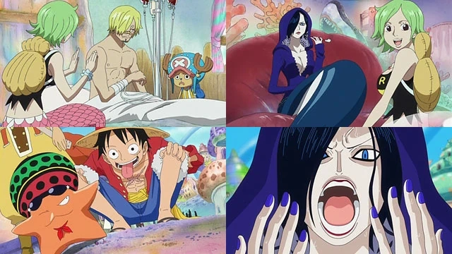 Usopp, Luffy, Chopper y Camie, encuentran a donantes de sangre para Sanji, que resultan ser dos Okamas. Chopper descubre que Luffy tiene marcas de una picadura venenosa pero no le pasa nada porque su cuerpo creó unos anticuerpos contra el veneno después de ser envenenado por Magellan. Mientras, en la cueva de las sirenas, Ishilly abre el barril donde estaba Caribou. Camie lleva a Luffy y a Usopp a la trastienda del Mermaid Café donde esta Madam Shyarly, quien predijo la gran era de los piratas, la Guerra de Marineford y la muerte de Barbablanca, y allí se conocen. Al entrar en el mermaid café ven a Brook que ha sido rescatado por Pappag. Este les lleva a su casa en taxi. Pero antes de entrar, en el vehículo, Brook ve un cartel de «se busca» de Vander Decken, el capitán del barco fantasma de antes. Brook se pregunta como se puede buscar a un pirata fantasma. Pero Pappag y Camie le dicen que el legendario pirata Vander Decken nació y murió en la isla gyojin pero el pirata del cartel y que vieron antes en el holandés errante era su descendiente Vander Decken IX. Y se estaba buscando a ese pirata porque le estaba mandando cartas y proposiciones de matrimonio a la princesa Shirahoshi, quien estaba muy asustada, y por eso lo mandaron a buscar. Mientras iban en el taxi Luffy ve una bandera pirata en la fábrica de dulces. Pappag le cuenta que esa bandera es de la Emperadora Big Mom ya que esta pirata esta protegiendo la Isla Gyojin después de la muerte de Barbablanca. Luffy cree que Big Mom es una buena persona, pero Pappag le dice que Barbablanca protegía la isla por nada a cambio, pero Big Mom lo veía como un negocio, ya que cada mes debían entregarle 10 toneladas de dulces para que protegiera la isla. Luego se ve a Madame Shyarly teniendo una visión de que Luffy iba a destruir la Isla Gyojin.
