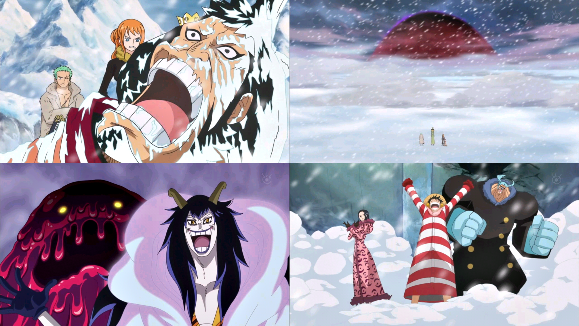 - Las posiciones de Brook, Sanji y Zoro mientras están imaginando a los yetis es diferente en el anime. De izquierda a derecha en el manga, es Zoro, Sanji y Brook. En el anime, es al revés.