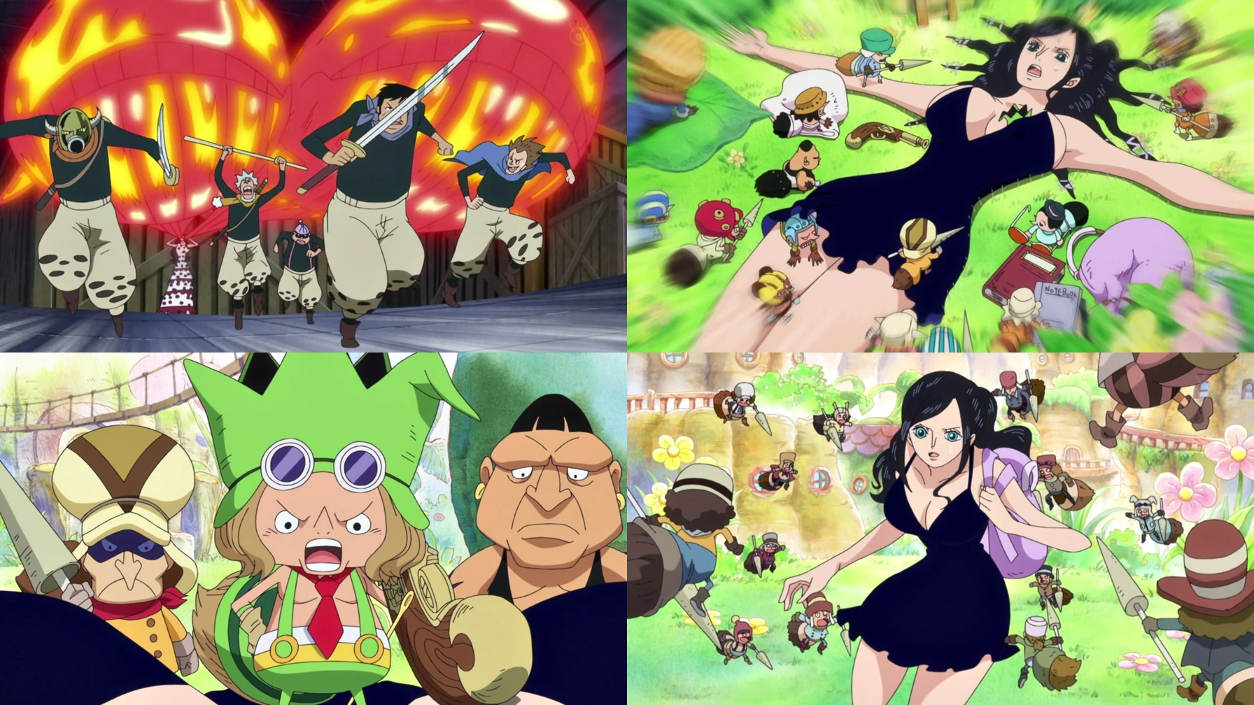 En Green Bit, Robin, tiene a la persona pequeña atrapada, a quien le pregunta si él fue quien le robó a los soldados de la marina, entonces, escucha unas voces de personas que están entre la hierba. Usopp se la acerca, y se sorprende de la pequeña persona, en ese momento desde el césped les disparan unas semillas que sueltan un gas que les deja dormidos, entre el césped aparecen hablando unas personas pequeñas, diciendo que al haberles visto, tienen que ocuparse de ellos.