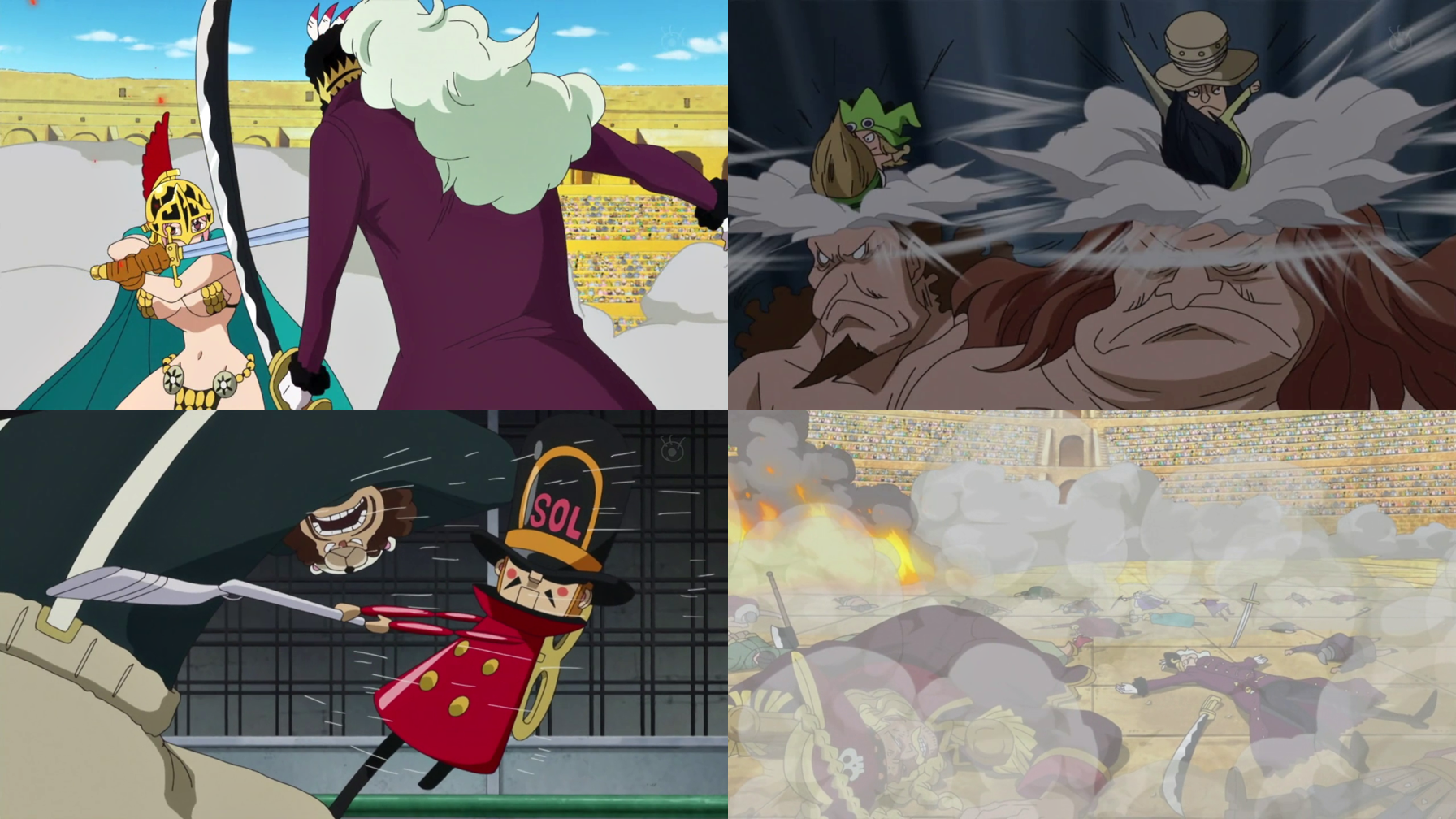 Suleiman enfrenta a Rebecca, mientras se conocen datos del sicario, la batalla se le complica a Rebecca debido a la velocidad y poder de Suleiman, en un momento Rebecca pierde su espada y está a punto de ser cortada, pero Acilia la mueve y recibe el ataque de Suleiman y es derrotada por éste. En el mundo subterráneo, Usopp y Robin saben más acerca del plan SOP, pero son encontrados por subordinados de Doflamingo, aunque son asaltados y derrotados por los Tontatta, quienes les entregan la ropa de los subordinados derrotados para que puedan infiltrarse y ejecutar el plan. Mientras tanto, algunos subordinados de los Piratas Donquixote van hacia la Casa de Juguetes en el ascensor, donde son encontrados por el soldado de juguete quien empieza a recordar momentos con Rebecca y a vencer a cada uno de los subordinados. En el Coliseo Corrida, misteriosamente los competidores en el Bloque D aparecieron derrotados, pero una persona misteriosa logra levantarse.