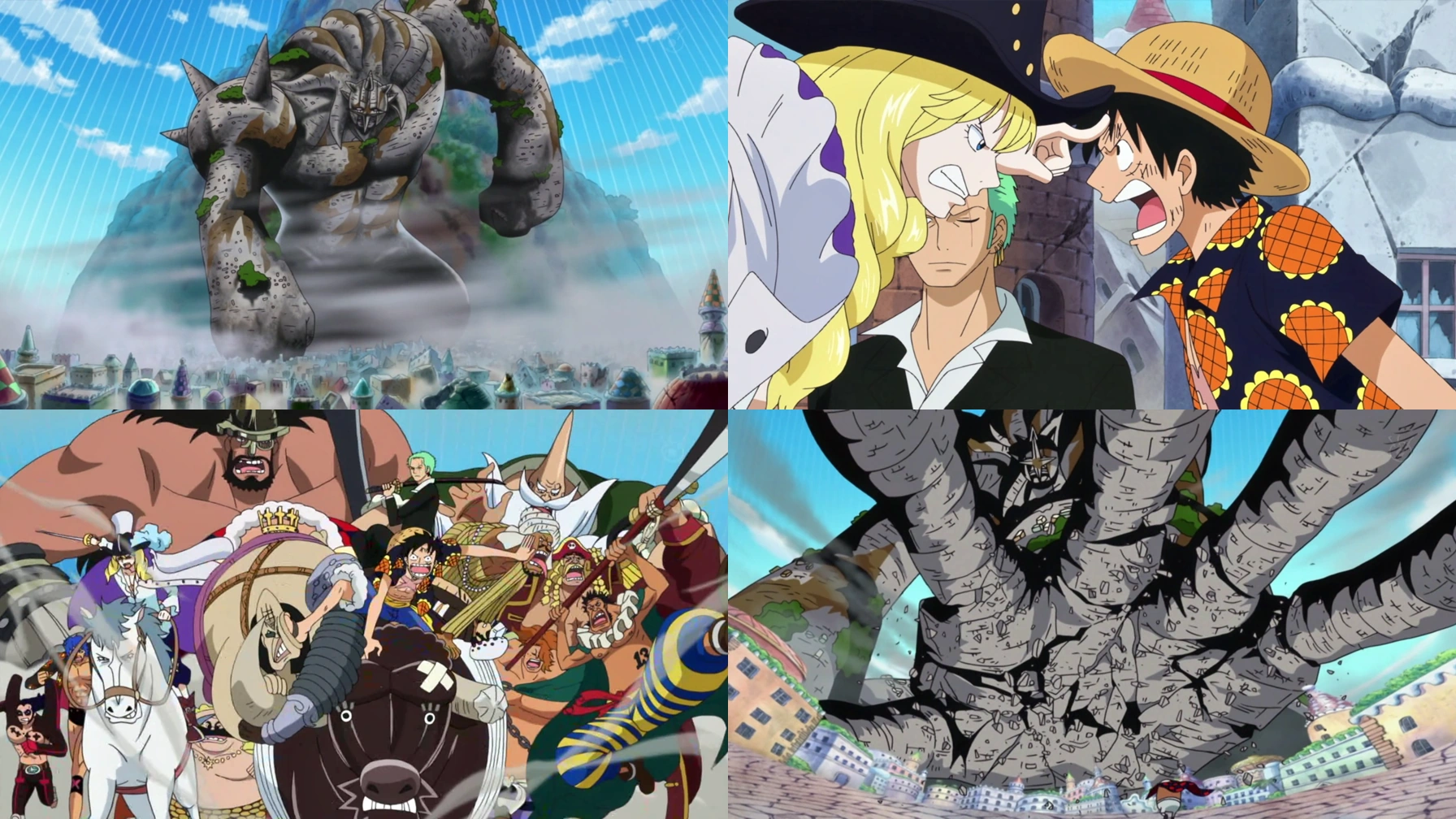Comienza con Zoro que sale de los escombros y se encuentra con Luffy y Law que sobrevivieron. Cavendish entra y da gracias a Luffy para él y empieza a explicar sobre cómo él matará a Doflamingo. Luffy se aleja y comienza a ser perseguido por cazadores de recompensas, y Chinjao atrapa a Luffy y le da las gracias. La mayoría de los otros competidores fuertes del Coliseo vuelven y pelean sobre quién va a matar a Doflamingo, y luego la lucha contra Pica comienza mientras Luffy trata de huir del resto de los competidores del Coliseo. Pica ve a Luffy y lanza un puñetazo con su enorme brazo de piedra, por lo que Chinjao y Elizabello II responden utilizando el Kiryu Kirikugi y el King Punch, respectivamente, y destruyen el brazo de Pica.
