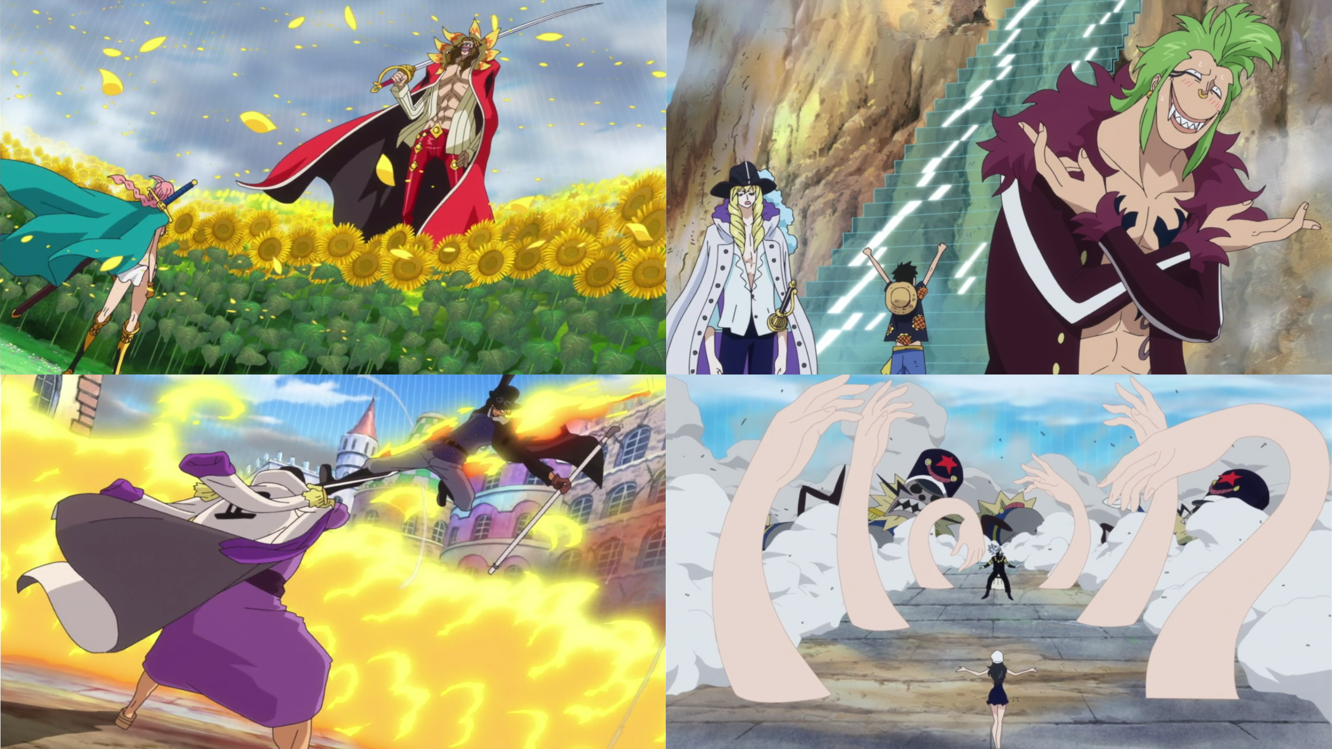 Rebecca acaba de llegar al campo de girasoles, Leo y Kabu se marchan a buscar a la princesa Mansherry, entonces esta última se queda sola. Diamante la descubre, el cual estaba durmiendo en el suelo esperándola, y la ataca. En el tercer nivel, Gladius, no para de disparar a Luffy y a Law, Bartolomeo, les defiende con sus barreras, y crea unas escaleras con su barrera para que puedan ascender al cuarto nivel donde se encuentra Rebecca.