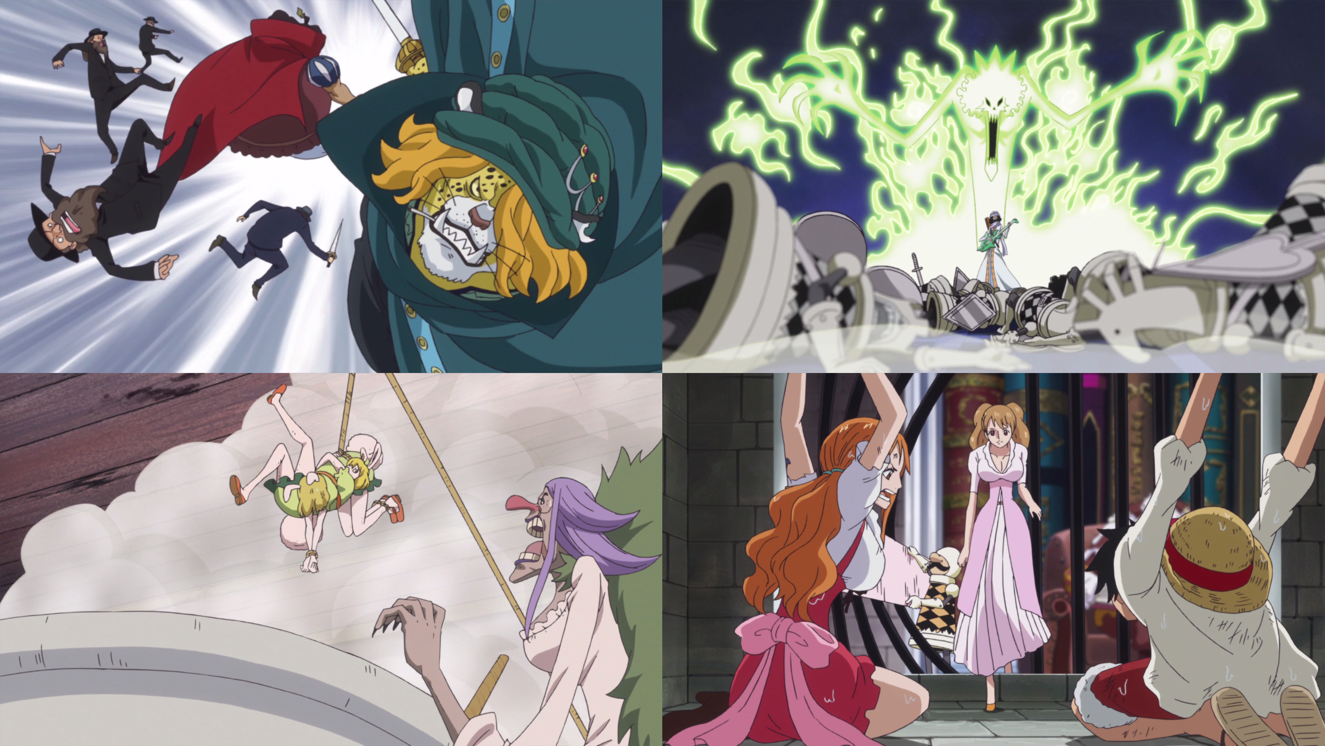 Pedro sigue con el plan de ser un señuelo pero Tamago se da cuenta, Smoothie espera tras la puerta a la salida de Brook. Brook pelea con los enemigos dentro de la habitación del tesoro con su Soul King arrebatando las almas de Big Mom a los soldados. Sanji va en busca de flores para Pudding. Chopper explica el plan que tiene con Carrot para vencer a Brulée. Mientras Luffy y Nami se encuentran encerrados en la biblioteca del Whole Cake Chateau, aparece Pudding y les pide disculpas por no haber podido llevar a Sanji a la orilla acordada y les cuenta sobre la propuesta que le hizo Sanji.