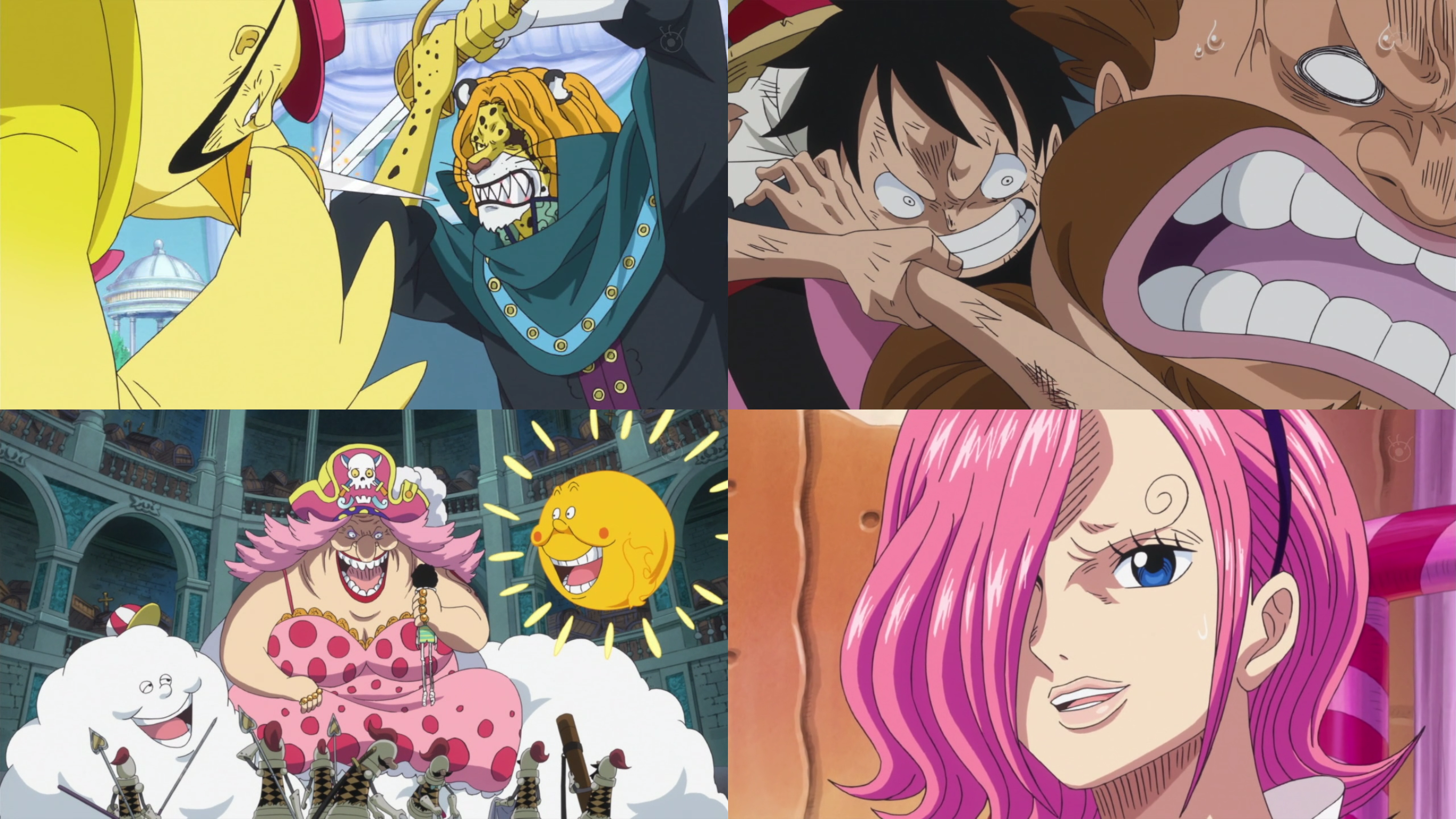 Luffy sale de la prisión con la intención de recorrer el castillo en busca de Sanji peleando por el camino con diversos enemigos. Al mismo tiempo Sanji sigue hablando con Reiju acerca del plan verdadero de ambos bandos con su matrimonio, Reiju realmente está a favor de que la familia Vinsmoke no merece vivir y confiesa que ella cambió los brazaletes, por lo que no explotarán si Sanji decide irse. Sigue la lucha de Pedro, complicándose porque Tamago 'evoluciona' con el poder de su fruta volviéndose más fuerte. Se muestra el conflicto de Big Mom y Brook, siendo derrotado por ella pensando que había robado la "Tamatebako" y otros tesoros, en ese momento aparece Pudding revelando que aún no se había despertado en ella "el poder de la tribu de los tres ojos".