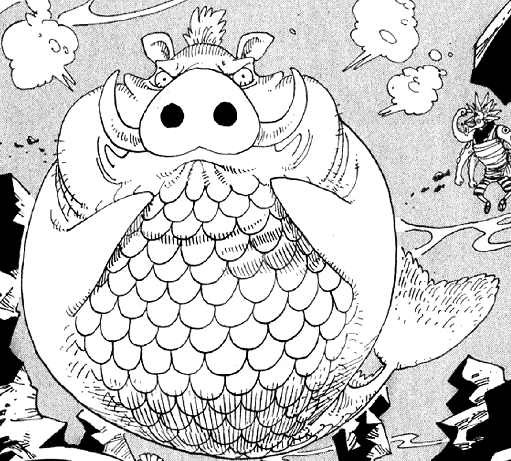 - ↑ One Piece manga — Vol. 21 Capítulo 193, minihistoria: Paseo por el fondo marino de Hatchan Vol. 11, Hatchan rescata a un jabalí marino.