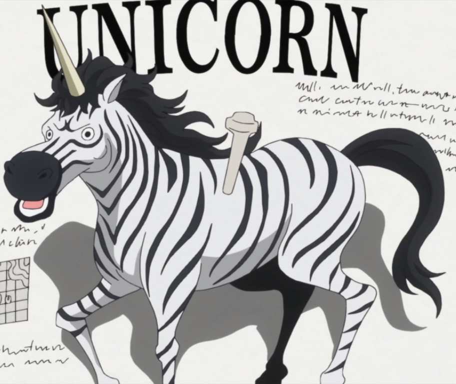 Los unicornios (ユニコーン Yunikōn?) son criaturas mitológicas parecidas a los caballos pero con un cuerno en medio de la frente, no se sabe cuál es su hábitat natural. El primer unicornio visto en la serie era una cebra con un cuerno en la frente dentro de un libro que tenía Charlotte Linlin en Totto Land.[11]