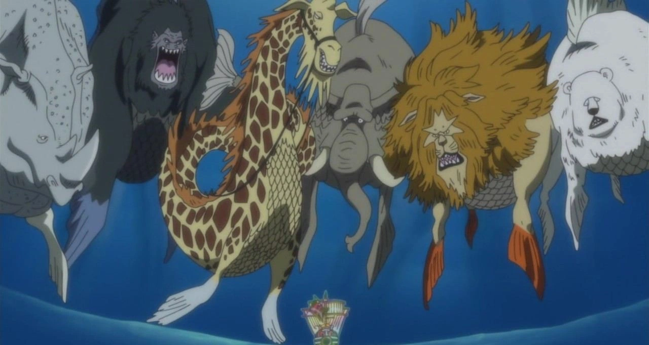 El rinoceronte marino (海サイ Umi sai?), gorila marino (海ゴリラ Umi gorira?), elefante marino (海ゾウ Umi zō?) y jirafa marina (海キリン Umi kirin?) son unos monstruos marinos que vive en las profundidades del océano. Todos pertenecen al ejercito de monstruos de los Nuevos Piratas Gyojin y fueron vistos por primera vez a las afueras de la isla Gyojin.[4] Ellos mas tarde transportarían a los Nuevos Piratas Gyojin hacia el Palacio de Ryugu, y otros a los tenientes junto a otros miembros, por distintas partes de la isla.[5] Todos los monstruos marinos serian derrotados por los príncipes en la plaza Gyoncordia.[6] El nombre del «elefante marino» es un juego de palabras, haciendo referencia al Elefante Marino de la vida real.