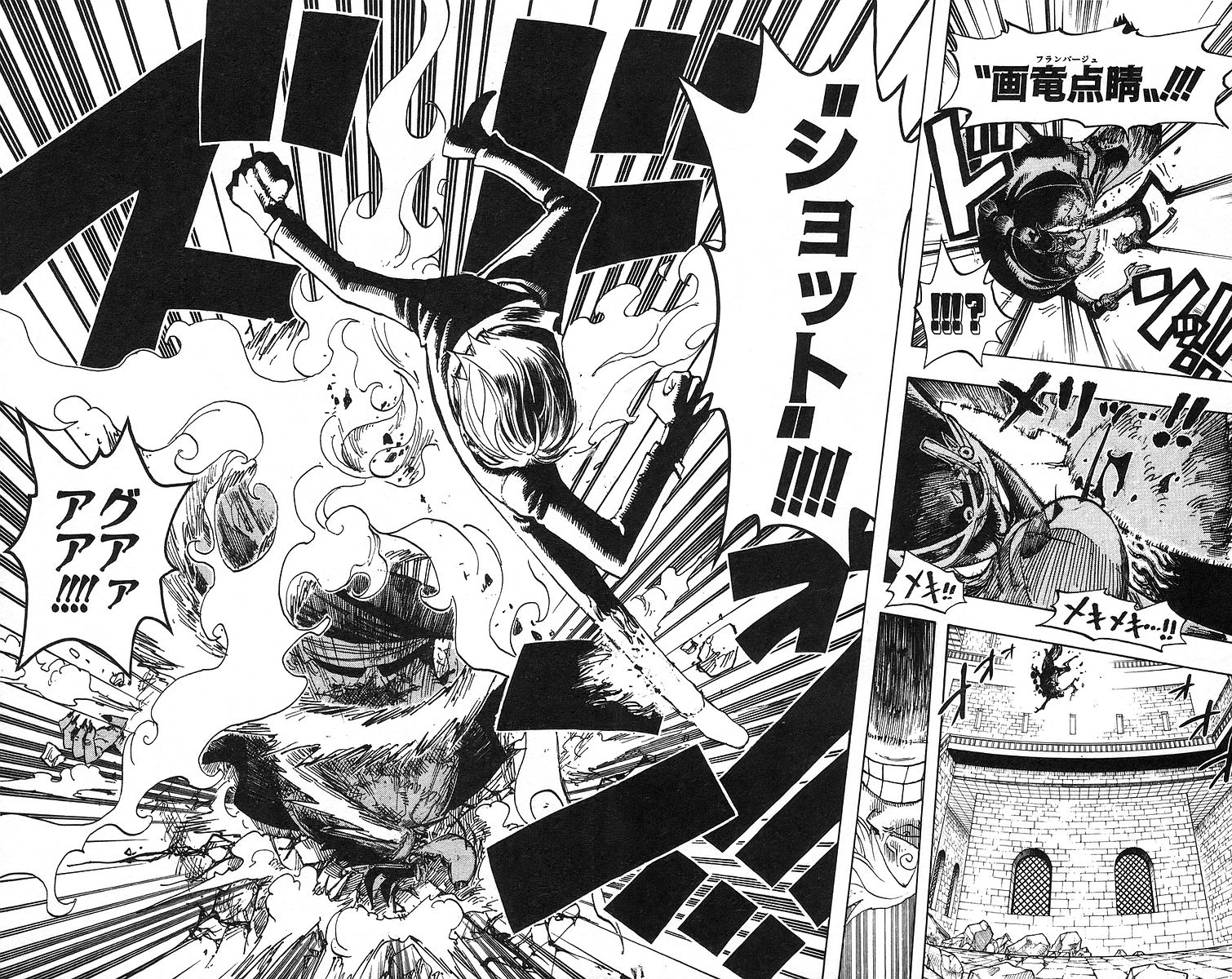 画竜点睛 ショット Furanbāju Shotto?, lit. «Disparo flambeado»): En el aire Sanji golpea la cabeza del oponente con la pierna de la diable jambe, así aumentando el poder y le lanza hacia abajo con gran fuerza y haciendo que el oponente gire hasta que se estrella con el suelo. Lo utiliza por primera vez para acabar con Jabra. En el manga y doblaje de España, esta técnica es llamada Golpe flambeado, y en el doblaje latino es llamado Tiro flameado.[3]
